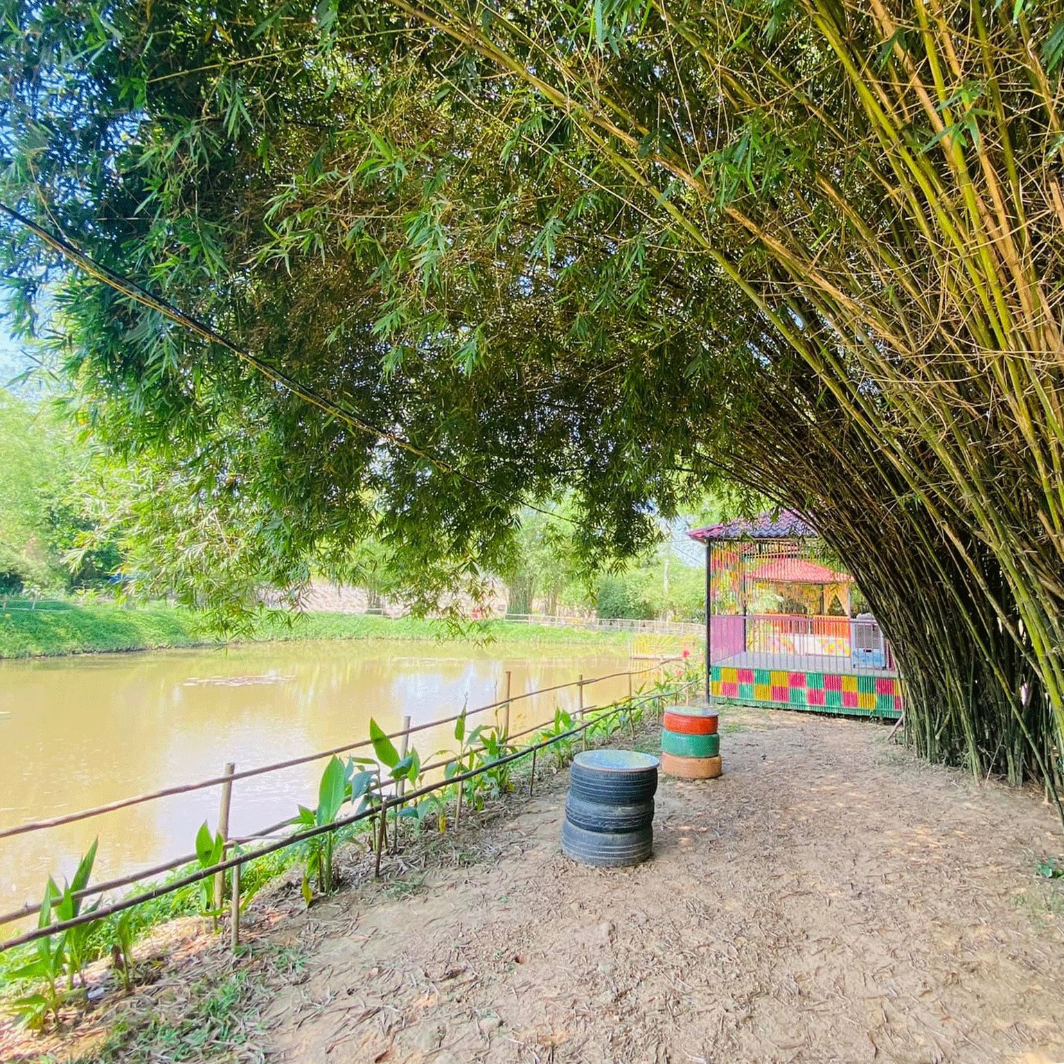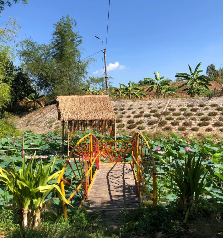 Nơi đó còn có vườn Trúc xanh lá rất nhỏ bé um tùm tạo vòng cong tuyệt mỹ, một hồ sen cũng khá thú vị để ngắm và khi đó bạn tha hồ chụp những kiểu ảnh tạo dáng cho từng phong cách ưa chuộng.