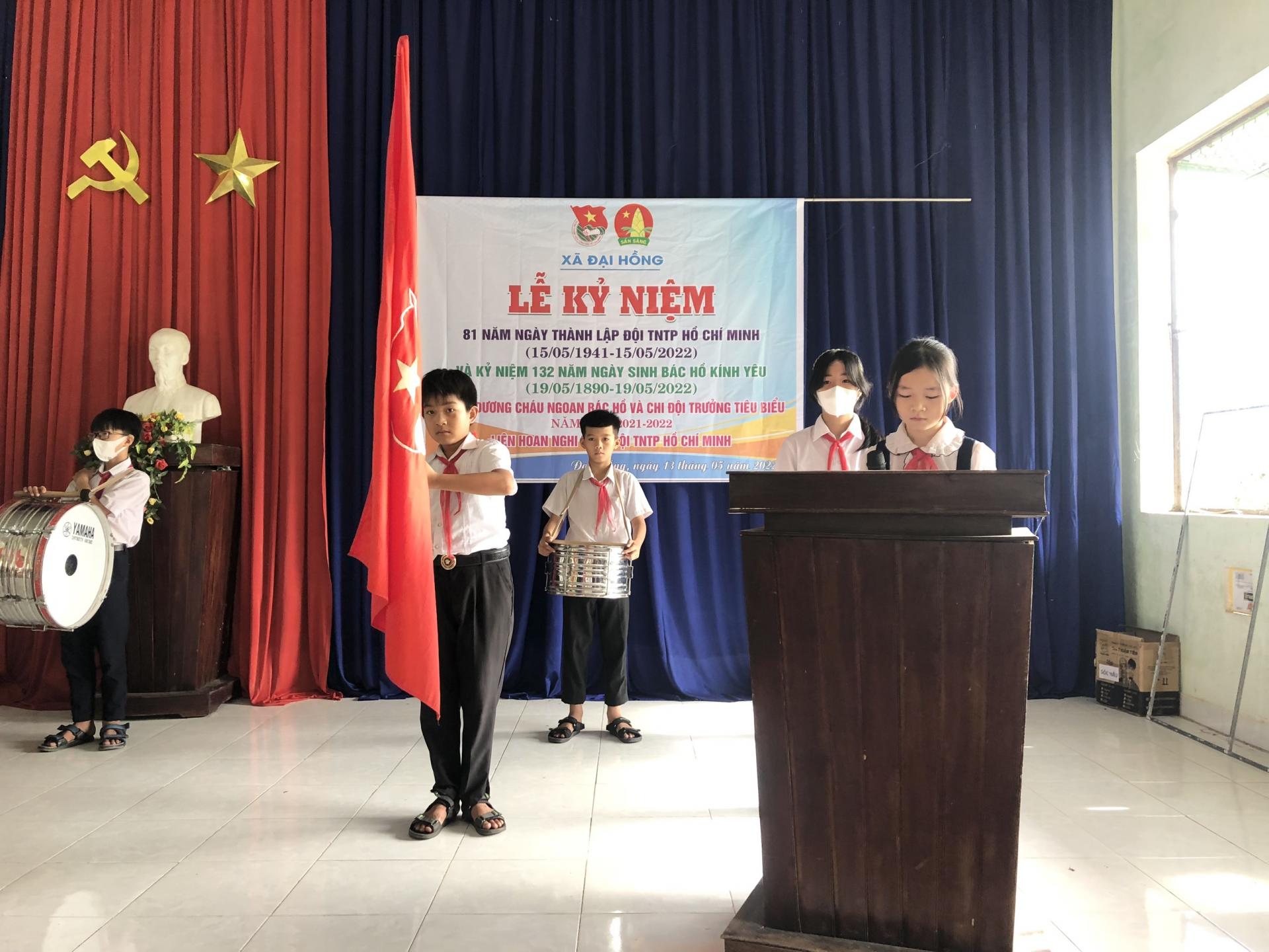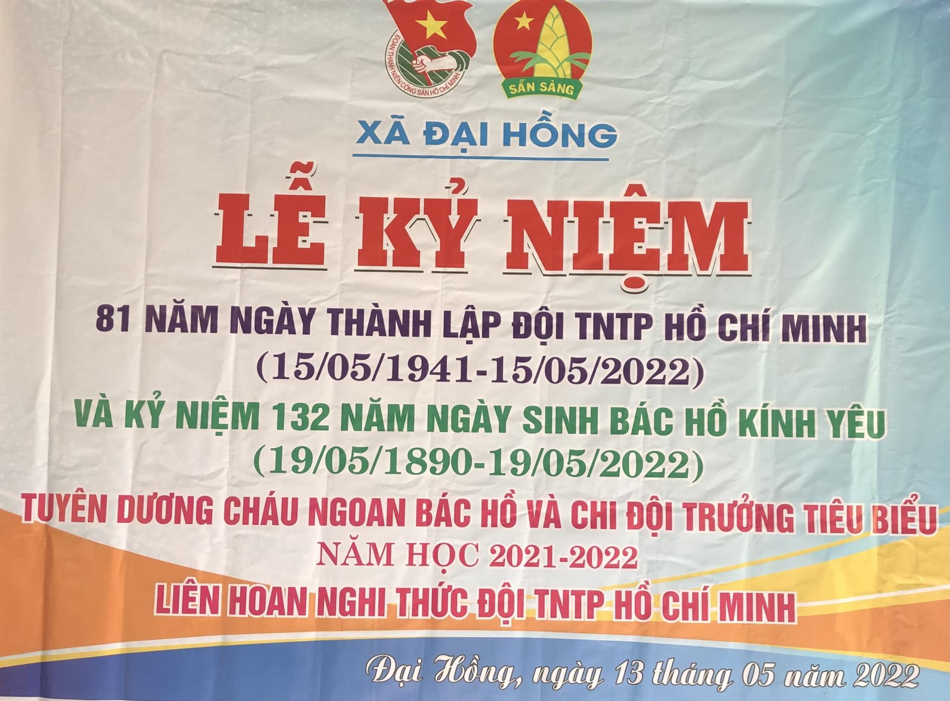 Được sự thống nhất và cho phép của Hội đồng đội xã Đại Hồng, Lãnh đạo nhà trường, sáng hôm nay ngày 13/5/2022 Liên đội trường Tiểu học Đại Hồng tổ chức buổi lễ sinh hoạt kỷ niệm nhằm nâng cao nhận thức, bồi đắp lý tưởng, niềm tự hào cho cán bộ, đội viên, thiếu niên, nhi đồng về truyền thống của Đội TNTP Hồ Chí Minh và phong trào thiếu nhi; khẳng định sự quan tâm của Đảng, nhà nước, các cấp, các ngành và vai trò của Đoàn thanh niên công sản Hồ Chí Minh đối với công tác chăm sóc, giáo dục, bảo vệ trẻ em; khơi dậy quyết tâm thi đua học tập và rèn luyện, phấn đấu trở thành người đoàn viên Thanh niên Cộng sản Hồ Chí Minh. Nâng cao tính tự giác của đội viên nhi đồng và tính tự quản của tổ chức Đội, giúp cho đội viên rèn luyện, phát triển toàn diện, trở thành con ngoan, trò giỏi, cháu ngoan Bác Hồ.