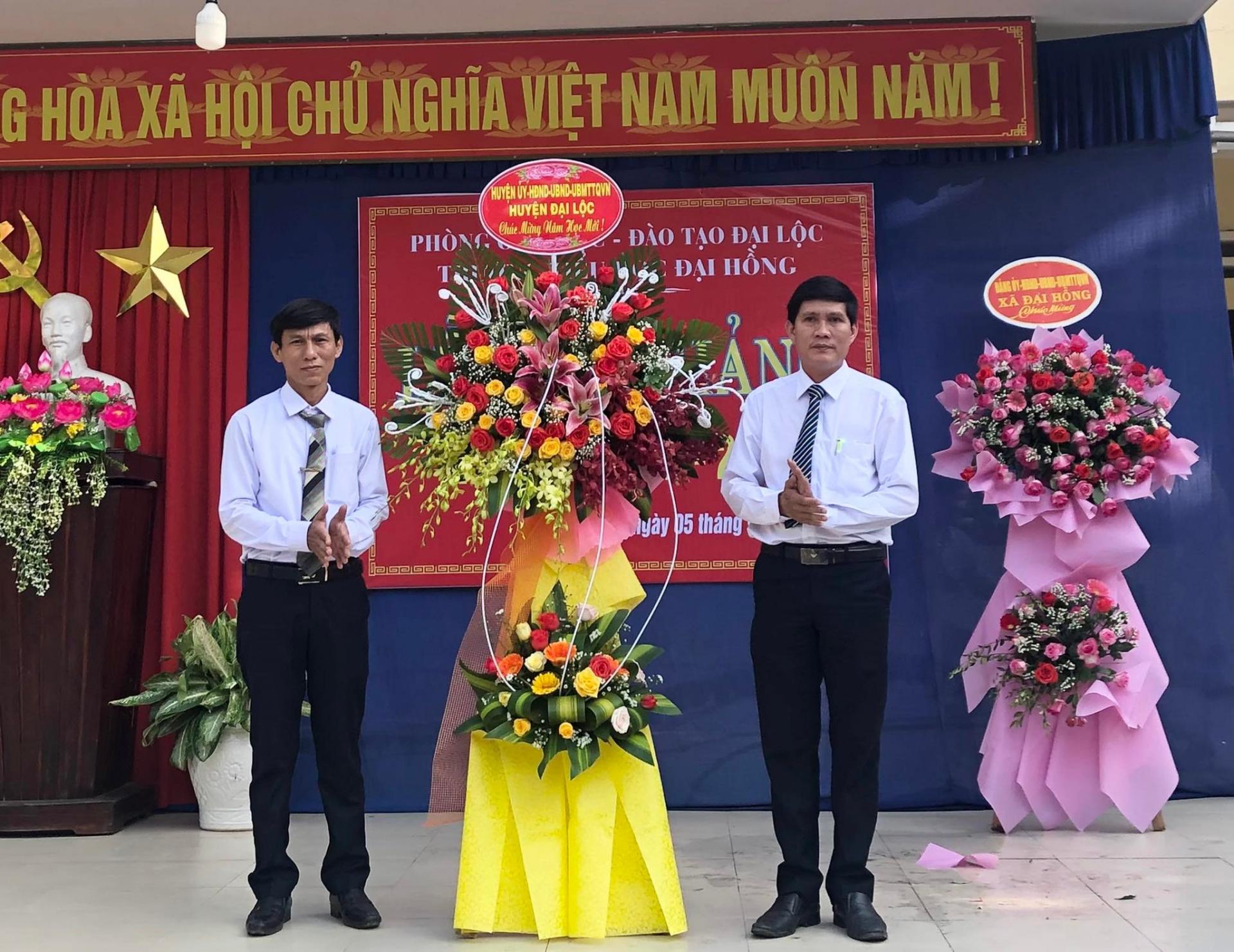 Thầy giáo Hồ Công Nhật- chuyên viên- Phòng GD&ĐT huyện Đại Lộc thay mặt các đ/c Lãnh đạo huyện ủy, UBND Huyện Đại Lộc lên tặng hoa chúc mừng